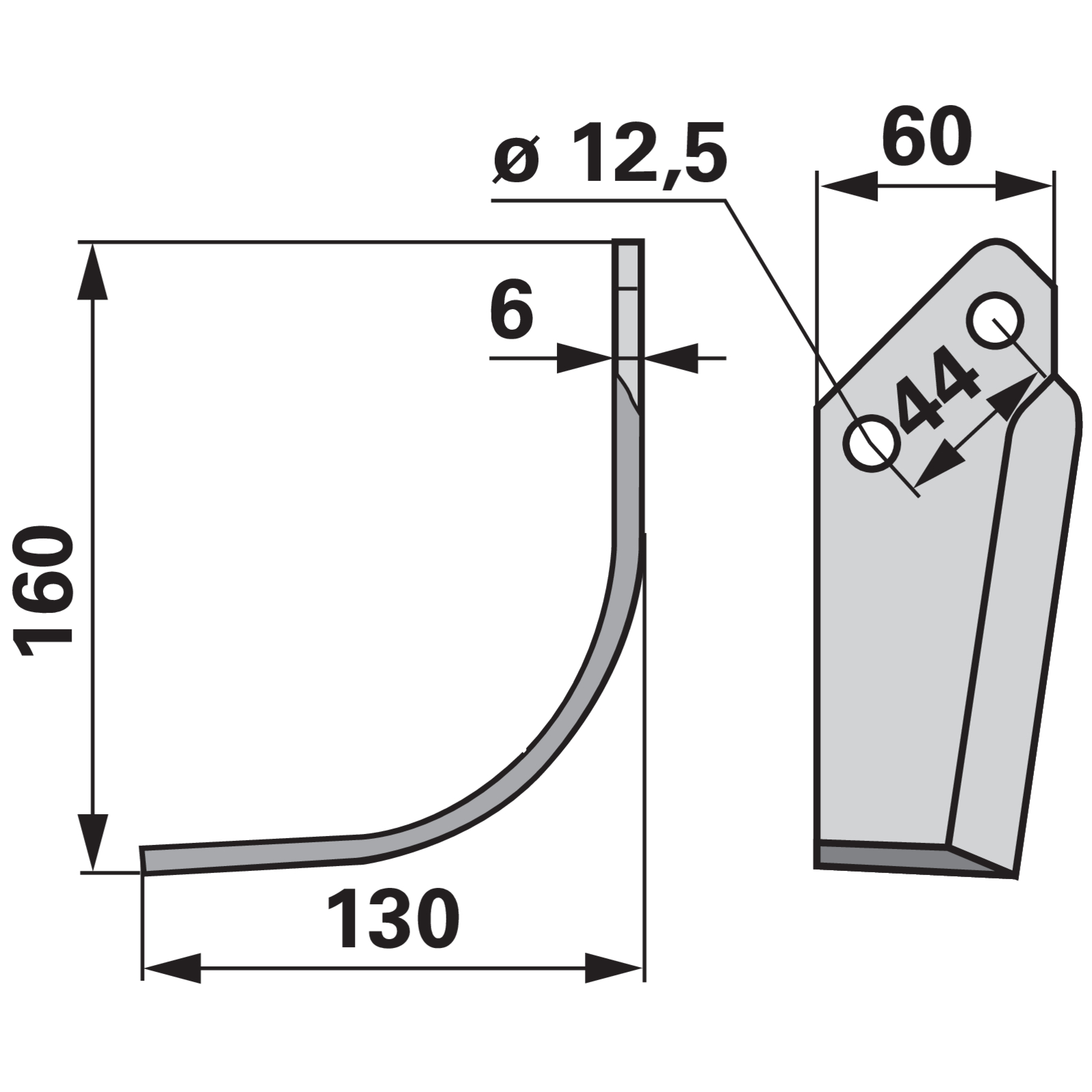 Bogenmesser links B130X6L160 Lochabstand 44