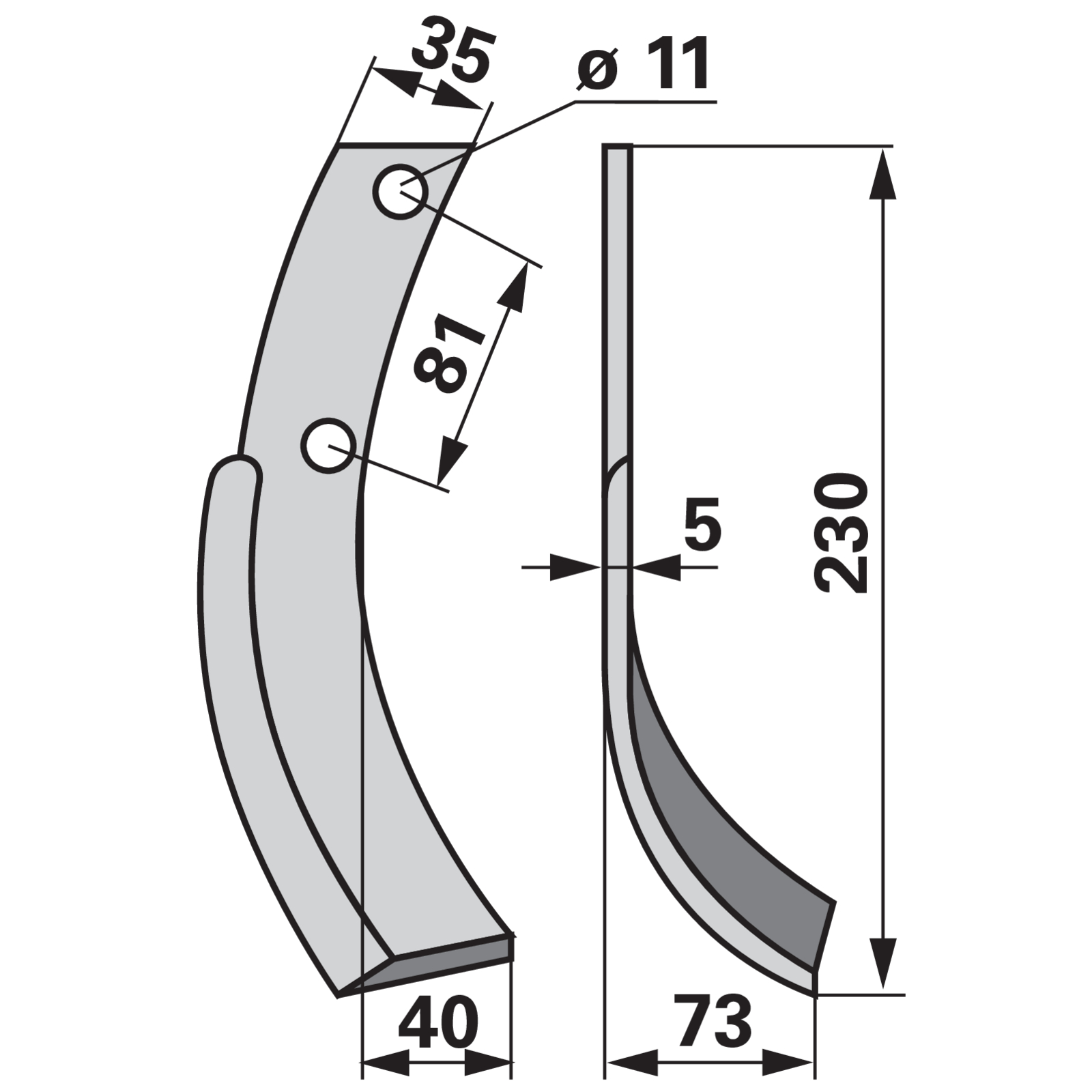 | Bezeichnung | Bogenmesser rechts 35x5 L = 230 Arbeitsbreite 73 LAB = 81 |
