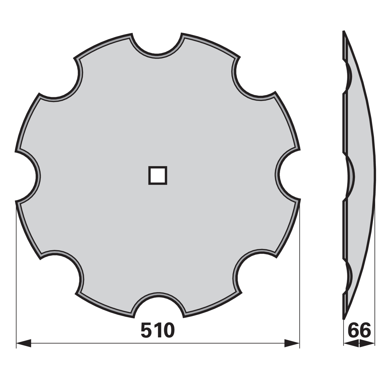 | Bezeichnung | Eggenscheibe gezahnt, 510 mm, Vierkant 31 x 31 mm, Stärke 5 mm |