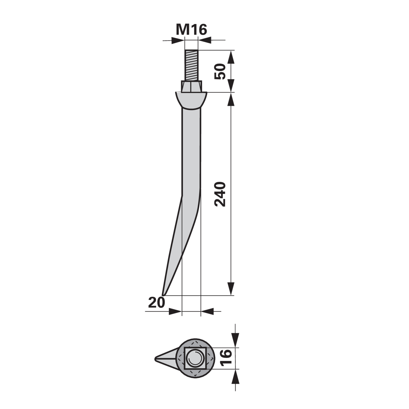 | Bezeichnung | Eggenzahn gebogen, vergütet, 20 x 240 mm, M16, Vierkant versetzt |
