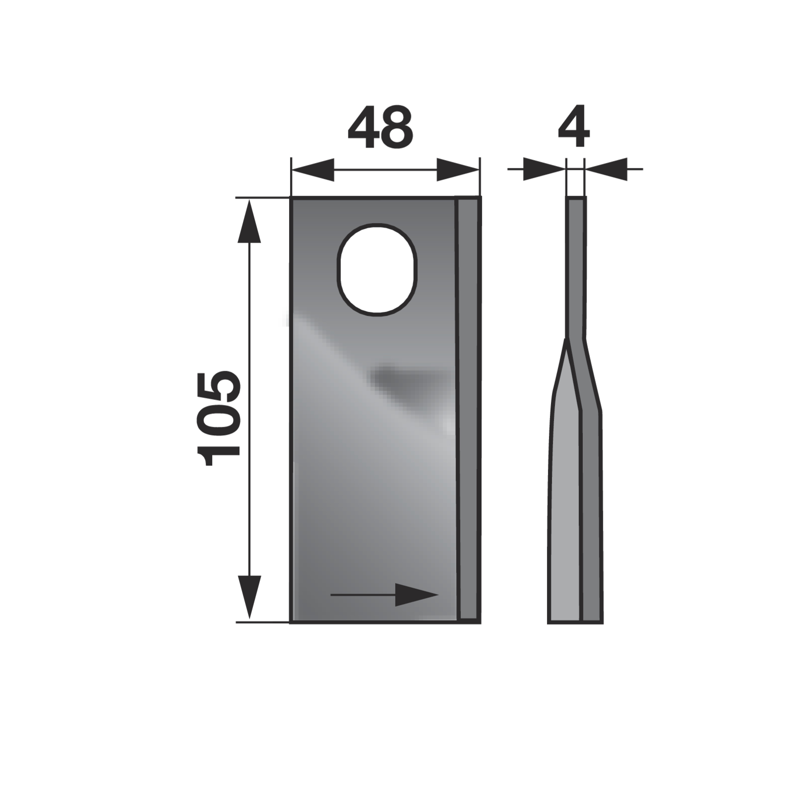 | Bezeichnung | Kreiselmäherklinge links, L 105 x B 48 x S 4 mm, LL 20,5 x 23 mm, 25 Stück Deutz-Fahr KT56784000 |