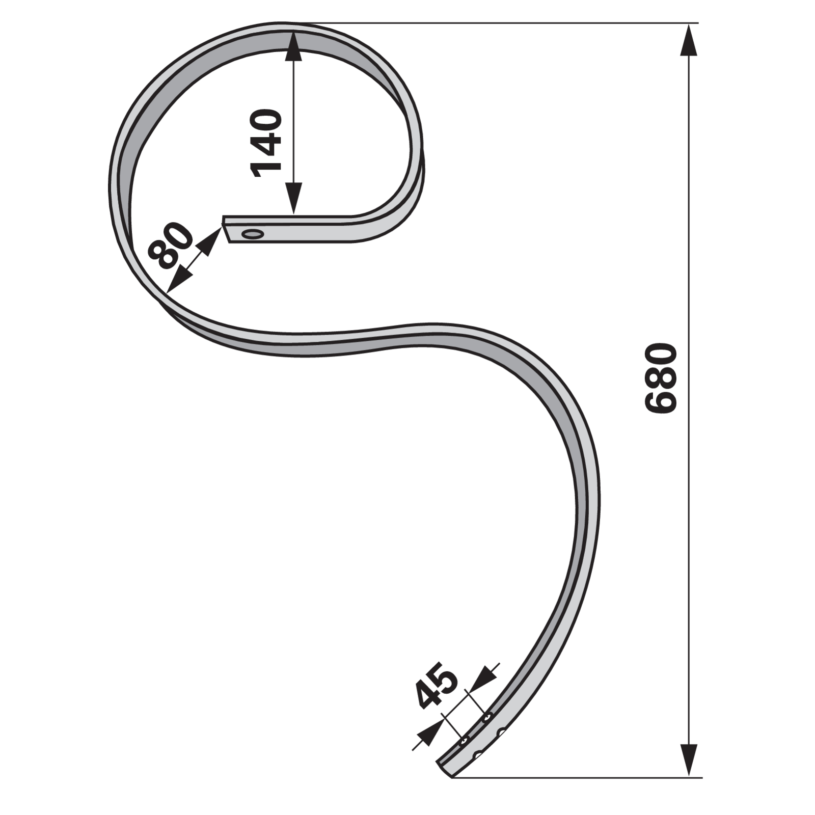 Kultivatorzinke Gebogen Ohne Schare, 45 X 12 X 680 Mm, Einbauhöhe 520 Mm