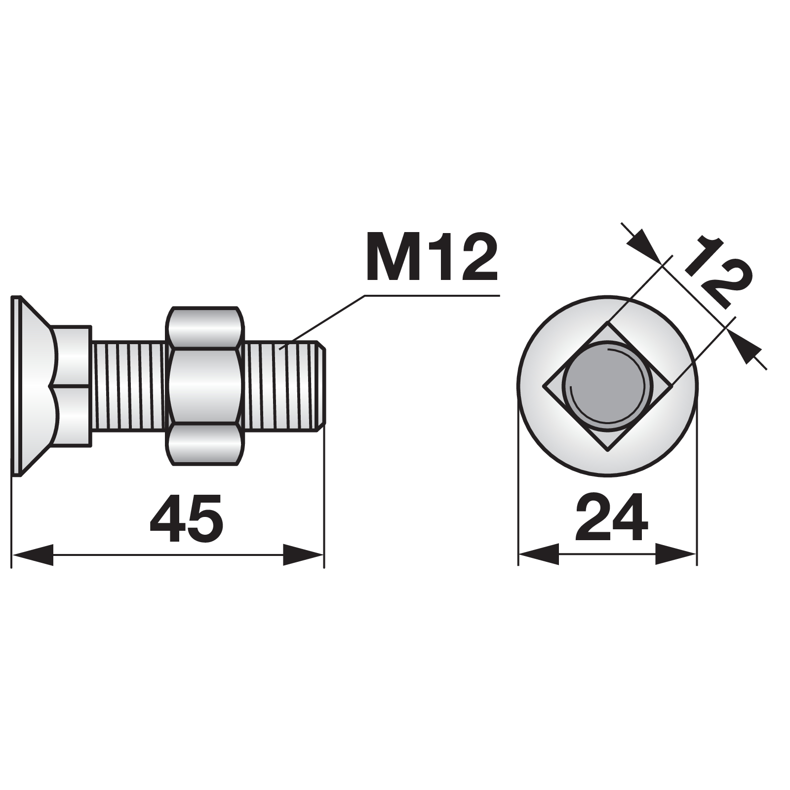 | Bezeichnung | Pflugschraube Vierkant, M12 x 45 mm, Güte 12.9 mit Mutter |