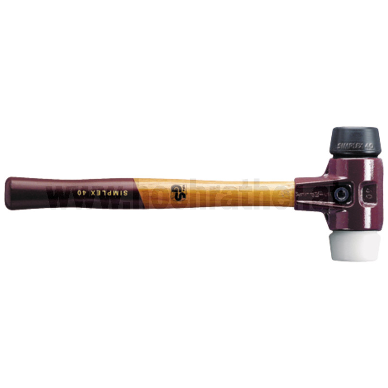 Version SIMPLEX–Schonhammer in der Einsatzkombination Gummikomposition (schwarz, mittelhart, dämpfend, geruchsneutral, verschleißarm) / Superplastik (weiß, mittelhart, sehr widerstandsfähig).